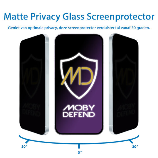Kies voor ultieme bescherming én privacy voor je iPhone 17 met de 2-Pack MobyDefend Matte Privacy Glass Screenprotectors. Met deze hoogwaardige screenprotectors bescherm je niet alleen je touchscreen van je telefoon tegen stoten, krassen en barsten, maar deze screenprotectors beschermen ook tegen nieuwsgierige blikken!Hoogwaardige kwaliteit: De MobyDefend Matte Privacy Glass Screenprotectors zijn gemaakt van gehard glas en bieden bescherming van de hoogste kwaliteit. Bij een harde stoot vangt de screenprotector de klap op, zodat het scherm van je telefoon onbeschadigd blijft. Het scherm van je telefoon blijft zo in topconditie, hoe intensief je hem ook gebruikt.Privacybescherming: MobyDefend maakt gebruik van moderne privacyfilter-technologie die de kijkhoeken beperkt, zodat je scherm alleen voor jou zichtbaar is. De matte afwerking van de screenprotector geeft niet alleen een unieke look, maar zorgt er ook voor dat het scherm van je telefoon in verticale richting al vanaf een hoek van 30 graden verduisterd wordt. Hierbij geldt, hoe donkerder je het scherm van je telefoon instelt, hoe sneller de privacyfunctie zijn werk doet.Gebruik je je telefoon in horizontale richting? De slimme privacyfilter zorgt ervoor dat het scherm in deze richting niet verduisterd wordt, zo kan je probleemloos video’s blijven kijken op je smartphone.Behoud van functionaliteit: De aanraakgevoeligheid van het scherm blijft behouden, zodat je net zo makkelijk kunt swipen en scrollen als voorheen. Bovendien beschikken de screenprotectors over een uitsparing voor de frontcamera, zo blijft de beeldkwaliteit van je selfiecamera onaangetast.Eenvoudige installatie: De MobyDefend Matte Privacy Glass Screenprotectors zijn makkelijk te plaatsen. Volg de meegeleverde instructies en geniet binnen enkele minuten van optimale bescherming voor je telefoon én je privacy.